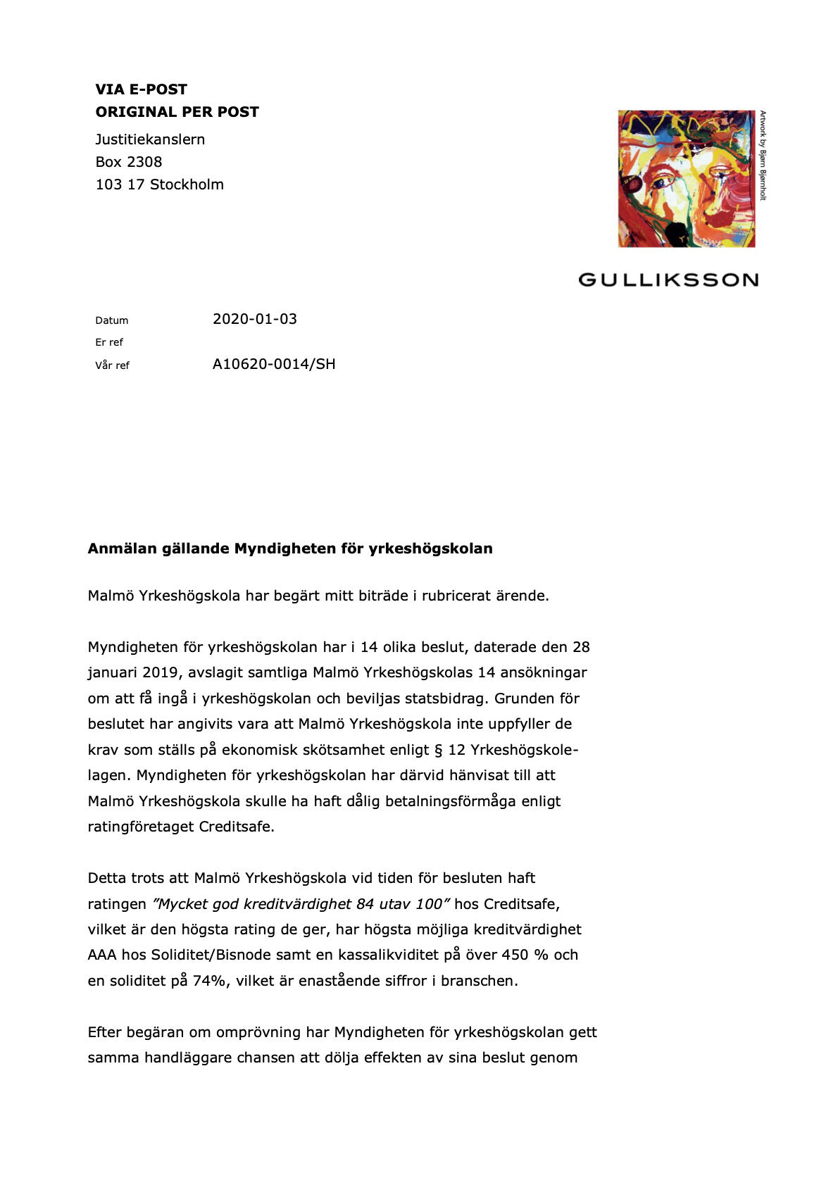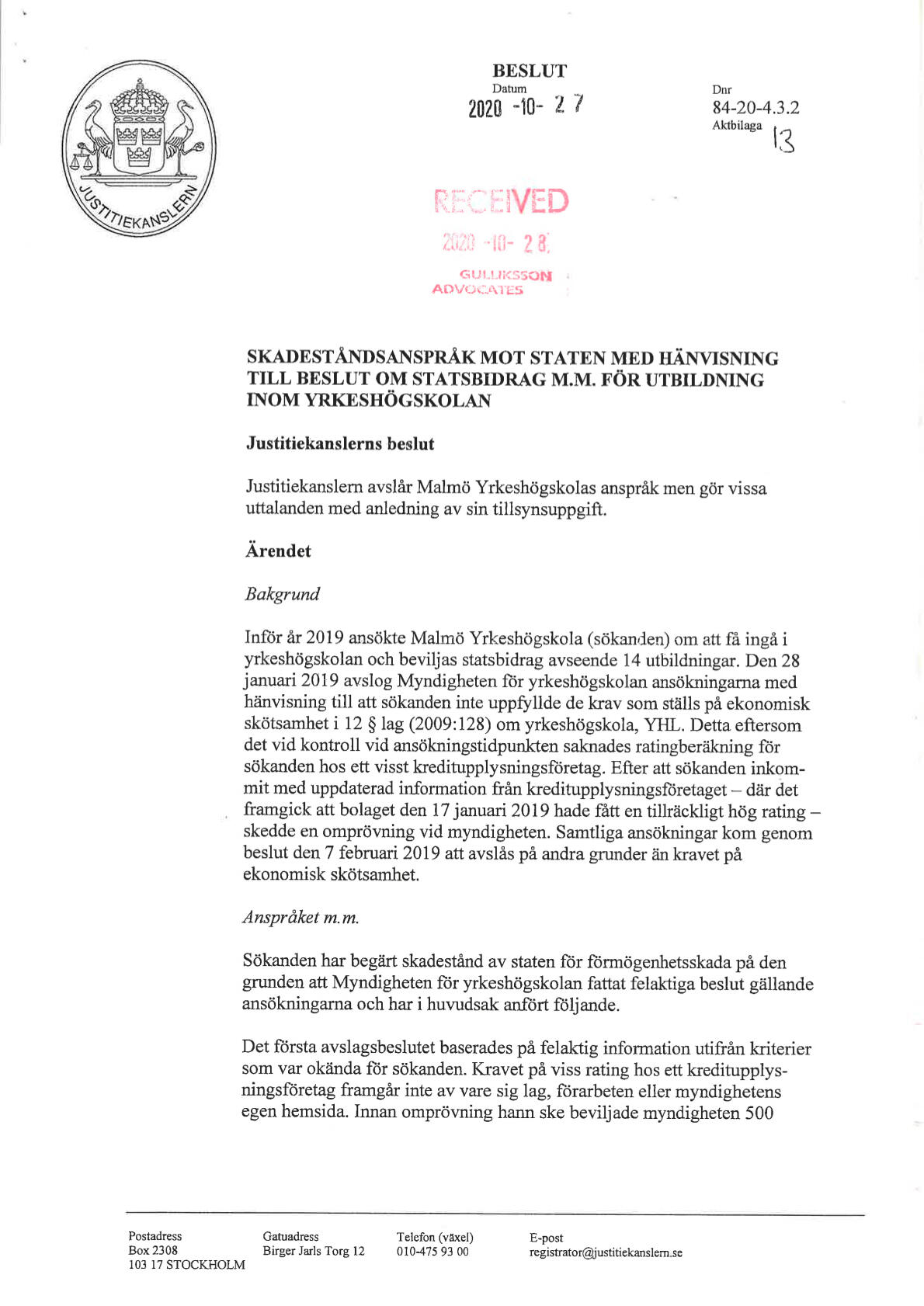 Här publiceras de dokument som tillsänts Justitiekanslern gällande den anmälan som Malmö Yrkeshögskola gjorde mot Myndigheten för yrkeshögskolan under 2020.För mer information, var god kontakta [email protected]
