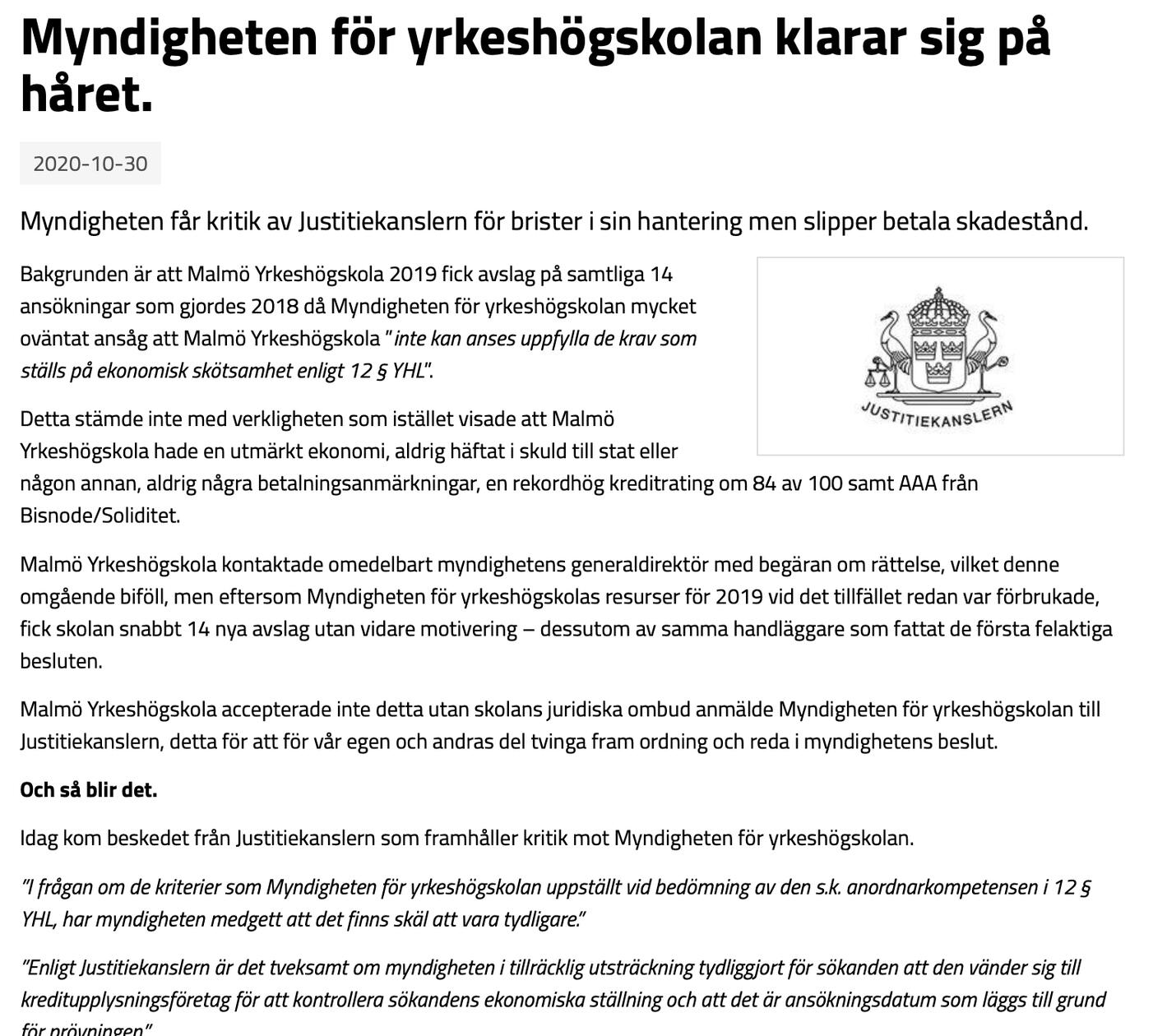 Bakgrunden är att Malmö Yrkeshögskola 2019 fick avslag på samtliga 14 ansökningar som gjordes 2018. Detta på mycket oklara grunder.Läs artikeln på Linkedin här!